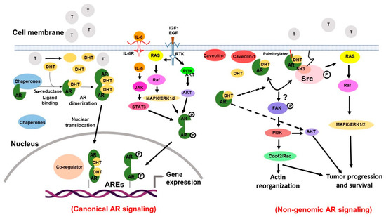 Androgen receptor (AR) is a nuclear transcription factor and a steroid hormone receptor. The gene encoding for the AR is located on the chromosome Xq11.2-q12, consists of 8 exons [26] and spans 186,587 kb (Figure 2). The structure of AR bears high similarities with other steroid receptors such as progesterone receptor (PR), estrogen receptor (ER), glucocorticoid receptor (GR), and thyroid hormone receptor (TR) [27,28]. It has four domains: a moderately conserved ligand-binding domain (LBD), a highly conserved DNA-binding domain (DBD), a poorly conserved N-terminal domain (NTD), and the hinge region separating the LBD from the DBD. The NTD accounts for more than half of the size of the AR, and is encoded by exon 1. Within the NTD, an Activating factor 1(AF1) region is present, which is considered its primary effector region. The AF1 consists of 2 transcription activation units i.e., Tau-1 (aa 100–370) and Tau-5 (aa 360–485) and both of which are indispensable for the complete transcriptional activity of the AR. Tau-1 contains FQNLF motif (aa 23–27) and Tau-5 contains the WHTLF motif (aa 433–437), which are critical in mediating the ligand-dependent, inter-domain interaction between the NTD and the LBD. NTD-LBD interaction is important for the stability of the AR dimer complex [29]. The NTD also contains a poly-glutamine sequence encoded by a CAG triplet repeat sequence, which begins at codon 58, and CAG repeat length has often been inversely associated with the risk of getting prostate cancer [30]. DNA-binding domain (DBD) is encoded by exons 2 and 3, and comprised of two zinc finger motifs. Exon 2 encodes for the α-helix N-terminal zinc finger, which interacts with the nucleotides located in the hormone response element in the DNA major groove. Exon 3 encodes the second zinc finger containing a conserved D-box motif (ASRND). The selectivity to specific DNA response element is known to be achieved by AR dimerization through the Distal box region that allows the AR to bind to direct repeat half-sites in its promoter. The nuclear localization signal present at the junction between the DBD and the hinge region is important for the nuclear import of the AR [30,31,32]. Ligand binding domain (LBD) is encoded by exons 4–8 and required for the binding of AR to its ligands, testosterone and dihydrotestosterone (DHT). Majority of the AR point mutations in prostate cancer have been identified in the LBD suggesting their importance in pathobiology associated with aberrant AR signaling. Hinge region is a short amino acids sequence that possesses a bipartite ligand-dependent nuclear localization signal (NLS) and helps in the nuclear transport of the AR [33]. Furthermore, several AR splice variants (AR-V1, -V7, and -V9) lacking LBD are also commonly reported (Figure 2). Another splice variant, AR-V567es is also reported in prostate tumor [34,35,36,37]. Studies have documented that even though some AR variants lack LBD, they retain their ability to bind to DNA and promote constitutive gene transcription in the absence of androgens [38,39]. As per the canonical model of AR action, inactive AR resides in the cytoplasm sequestered by multiple chaperones and co-chaperones (such as heat shock proteins, FKBP51, FKBP52, and Cyp40), and cytoskeletal proteins [40]. Ligand binding to the LBD of AR triggers dissociation of chaperone proteins inducing conformational changes that enable AR dimerization and interactions with a cytoskeletal protein, Filamin A to facilitate its nuclear translocation. Nuclear AR binds to the androgen response elements (AREs) in the promoter and enhancer regions of the downstream target genes and forms transcriptional coactivator complexes that remodel the chromatin structure to access the target initiation site. Then, the complex stabilizes the RNA pol II machinery for repeated rounds of transcription. In parallel, ligand-independent activation of AR signaling via growth factors- and cytokines-mediated mechanisms has also been reported. For example, IL-6 binding to the IL-6 receptor causes MAPK- and STAT3- mediated transcriptional activation of AR [41]. Similarly, EGF in the absence of androgen is also shown to transcriptionally activate AR via RAS/RAF/MAPK and PI3K/Akt pathways [42,43,44]. Besides this genomic mode of action of AR, many of the cellular responses of androgens do not require AR-mediated changes in gene expression. It is established that ligand-bound AR can associate with other molecular effectors in the cytoplasm and inner part of the plasma membrane as well to activate cell signaling cascades [45,46]. AR-NTD is shown to interact with the SH3 domain of Src and this interaction results in unfolding of Src and subsequent autophosphorylation through the activation of kinase domain. The activation of Src also results in the elicitation of Ras-mediated MAPK/ERK signaling [47]. Some studies have shown that AR may be localized to the cell membrane via palmitoylation or other membrane proteins such as Caveolin [48,49]. The membrane-bound AR (mAR) can trigger cytoskeletal reorganizations via FAK/Cdc24/Rac1/PI3K and modulate the adhesive and migratory activity of prostate tumor cells [50,51] (Figure 3).