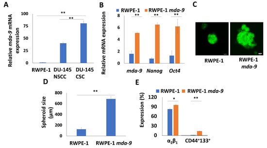 mda-9 Expression correlates with stemness markers. (A) Expression of mda-9 in normal prostate and prostate cancer stem cells. (B) Expression of Nanog, and Oct4 in mda-9 overexpressing normal prostate stem cells. (C) Confocal image showing the size of RWPE-1 cells in parental and mda-9 overexpressing prostaspheres. (D) Graphical depiction of the spheroid size in RWPE-1 prostaspheres in parental and mda-9 overexpressing cells. (E) Effect of mda-9 overexpression on normal prostate stem cell populations. The scale bars represent 20 µm. * p < 0.05, ** p < 0.01, using the Student’s t-test and ANOVA.