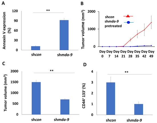 MDA-9 regulates survival and tumorigenic potential in PCSCs. (A) Effect of mda-9 kd in promoting PCSCs cell death analyzed by Annexin V assays. (B) Effect of mda-9 kd on PCSC tumorigenicity (n = 10). (C) Effect of intra-tumoral mda-9 kd on tumorigenicity (n = 10). (D) PCSC populations in tumors following intra-tumoral mda-9 kd. The bars represent SEM. ** p < 0.01 using the Student’s t-test and ANOVA.