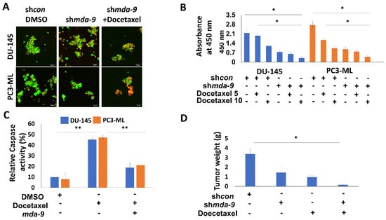 mda-9 regulates chemoresistance in PCSCs. (A) Effect of mda-9 kd on PCSC sensitivity to Docetaxel assessed by Live/Dead assay: live cells are green, dead cells are red. (B) Effect of mda-9 kd on PCSC sensitivity to Docetaxel (5 and 10 nM), assessed by MTT assay. (C) Effect of mda-9 overexpression on PCSC sensitivity to Docetaxel assessed by caspase activity. (D) Effect of intra-tumoral mda-9 kd on Docetaxel sensitivity measured by tumor weight (n = 10). The bars represent SEM. * p < 0.05, ** p < 0.01, using the Student’s t-test and ANOVA.