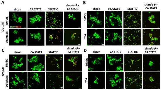 STAT3 activation is downstream of mda-9 and it regulates PCSC chemoresistance. Image analysis of shcon or mda-9 kd (shmda-9) PCSCs overexpressing constitutively active (CA) STAT3 or treated with STAT3 inhibitor STATTIC; (A) of DU-145 treated with or without Docetaxel, (B) of DU-145 treated with or without TSA (C) of PC3-ML treated with or without Docetaxel (D) of PC3-ML treated with or without TSA, live cells are green, dead cells are red.
