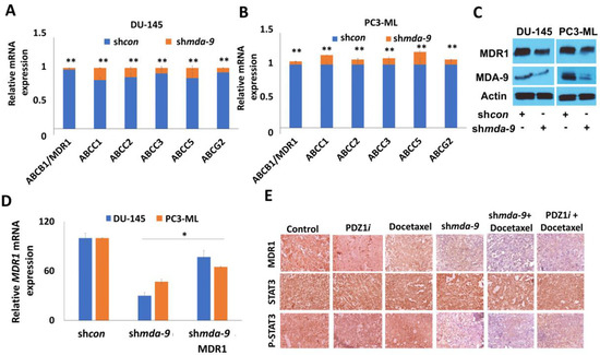 mda-9 regulates MDR1 expression in PCSCs. RT-PCR analysis to study the effect of mda-9 kd on ABC family gene expression in (A) DU-145 and (B) PC3-ML PCSCs. (C) Effect of mda-9 kd on MDR1 protein expression in DU-145 and PC3-ML PCSCs by Western blotting. (D) Effect of mda-9 kd on MDR1 mRNA expression in DU-145 and PC3-ML PCSCs (E) Expression of MDR1, STAT3 and P-STAT3 in control, mda-9 kd, PDZ1i and Docetaxel treated tumors analyzed by IHC (n = 8). The bars represent SEM. * p < 0.05, ** p < 0.01, using the Student’s t-test and ANOVA.
