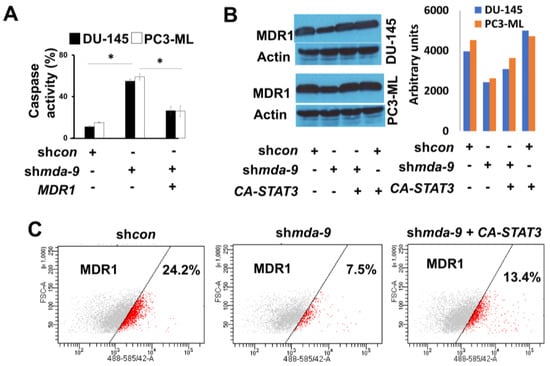 Since we observed a possible role of MDA-9 in PCSC chemoresistance, we analyzed the expression of the ABC family of genes in DU-145 and PC3-ML PCSCs (Figure 5A,B). We observed that the ABC family of genes was highly expressed in both cell lines with ABCB1 or MDR1/P-glycoprotein being the most significantly affected by mda-9 kd (Figure 5A–C). MDR1 mRNA expression decreased significantly in the shmda-9 group as compared to the shcon group (~33-fold in DU-145 and ~20-fold in PC3-ML, as shown in Figure 5D). The protein levels of MDR1 also decreased significantly in the shmda-9 group as compared to the shcon group (DU-145 ~1.7-fold and PC3-ML ~1.6-fold) as shown in Figure 5C and Figure S4A. Protein levels in ARCaP-M shmda-9 PCSCs decreased by ~three-fold, as shown in Figure 6C. When we analyzed in vivo mice tumor xenograft histologies, these results were substantiated (Figure 5E). mda-9 kd in PCSCs resulted in increased apoptotic cell death as evidenced by enhanced caspase 3 activity (Figure 6A), which was rescued by MDR1 overexpression (Figure 5D and Figure 6A and Supplementary Figure S4B). In addition, mda-9 kd-mediated MDR1 expression loss was significantly rescued by the overexpression of CA-STAT3 in DU-145, PC3-ML and ARCaP-M PCSCs (Figure 6B,C). These results show that MDR1 is important in lessening caspase-mediated cell death in mda-9 kd-treated cells (Figure 6A). STAT3 plays a very important role in MDA-9-mediated MDR1 expression, thereby contributing to chemoresistance to multiple drugs such as docetaxel and Trichostatin-A (TSA).
