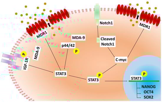 Schematic representation of MDA-9 mediated regulation of chemoresistance, in PCSCs. MDA-9 potentially regulates chemoresistance through IGF-1R/p44/42/STAT3/MDR1 and C-myc/MDR1 axis, and stem regulatory genes OCT4, NANOG and SOX-2 through STAT3.