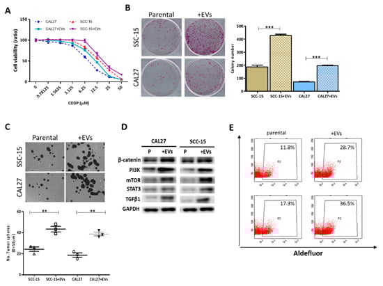 To explore the tumor-promoting function of CSC-EVs, we isolated EVs from CAL27 and SCC-15 tumorspheres cultured in serum-deprived culture media. We demonstrated that coculturing parental CAL27 and SCC-15 cells with CSC_EVs enhanced cell viability (Figure 1A) suggesting a role for CSC_EVs in the markedly increased CDDP resistance of cocultured CAL27 or SCC-15 cells, compared to their parental counterparts. We also showed that when cocultured with CSC-EVs, the ability of CAL27 or SCC-15 cells to form colonies was significantly enhanced by 2.67- (p < 0.001) and 2.24-fold (p < 0.001), respectively (Figure 1B). In addition, the tumorsphere-formation capability was increased by 2.04- (p < 0.01) and 1.76-fold (p < 0.01), respectively, in cocultured CAL27 and SCC-15 cells, compared to parental cells (Figure 1C). We also observed upregulated β-catenin, PI3K, mTOR, STAT3, and TGFβ1 protein expression levels in CSC-EVs cocultured with OSCC cells, compared to their parental counterparts (Figure 1D). Moreover, CSC-EVs enhanced the aldehyde dehydrogenase 1 (ALDH1) activity of CAL27 and SCC-15 cells by 16.9% and 19.2%, respectively (Figure 1F).