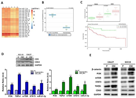 Cancer stem cells (CSCs) secrete extracellular vesicles (CSC_EVs) with oncogenic potential. (A) miR-21 is abundantly contained within EVs collected from six clinical oral squamous cell carcinoma (OSCC) samples []. (B) TCGA database analysis showed a strong reverse association between miR-21 and its target, the PDCD4 tumor suppressor. (C) Analysis of the GSE26549 database showed that increased PIK3CA and signal transducer and activator of transcription 3 (STAT3) mRNA levels were strongly associated with a higher risk of OSCC (upper panel) and shorter survival (lower panel, log-rank equal curves p = 0.00148). A comparative qPCR analysis (D) and Western blots (E) between cargo contents of CSC_EVs and EVs (parental cells). The insert depicts Western blots of cluster of differentiation 9 (CD9) and CD63 (markers of EVs) isolated from parental and tumor spheres (CSCs) of CAL27 and SCC-15 cells. CSC_EVs contained significantly higher levels of phosphatidylinositol-3 kinase (PI3K), transforming growth factor (TGF)-β1, mammalian target of rapamycin (mTOR), STAT3, and miR-21-5p compared to the parental EV counterparts. * p < 0.05; ** p < 0.01; *** p < 0.001.