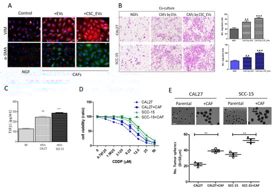 CAFs were shown to induce and/or facilitate the progression of many cancer types, including OSCC []. Here, we showed that CAL27 and SCC-15 CSC-EVs induced the transformation of NGFs into CAFs. We demonstrated that NGFs cocultured with CSC_EVs expressed markedly higher levels of CAF markers, namely α-smooth muscle actin (α-SMA) and vimentin (Vim) (Figure 3A). In addition, the resultant CAFs exhibited significant increases in migratory and invasive capabilities (Figure 3B) compared to their NGF counterparts. More importantly, CSC_EV-transformed NGFs secreted a substantially higher amount of TGF-β1, a key CAF cytokine, into the culture medium (Figure 3C). Furthermore, the transformation of NGFs into CAFS by CSC_EVs conferred a CDDP-resistant phenotype on cocultured CAL27 and SCC-15 cells (Figure 3D). Consistently, after coculturing with NGF-derived CAFs, we observed an increased ability to generate tumorspheres by CAL27 (1.90-fold, p < 0.01) and SCC-15 (1.45-fold, p < 0.01) cells compared to parental cells (Figure 3E).