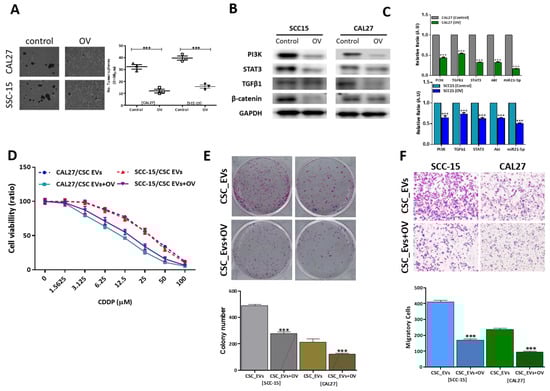 In addition to the demonstrated ability of OV to inhibit carcinogenesis in different cancer types by our group [,,,], the present study demonstrated that treatment with OV significantly suppressed the ability of CAL27 (2.91-fold, p < 0.001) and SCC-15 (2.67-fold, p < 0.001) cells to form tumorspheres (Figure 4A) with concomitant downregulation of PI3K, STAT3, TGFβ1, and β-catenin protein expression levels in OV-treated tumorspheres, compared to their control counterparts (Figure 4B). Next, our comparative analysis of gene expression profiles of CSC_EVs from control and OV-treated groups showed that CSC_EVs from OV-treated cells contained significantly lower amounts of cargo loads of PI3K, TGF-β1, STAT3, AKT, and miR-21-5p, compared to control CSC_EVs (Figure 4C). In addition, we demonstrated that 4 µM OV significantly enhanced the ability of cisplatin to suppress the viability of CSC_EV-cocultured CAL27 and SCC-15 cells, compared to their untreated counterparts (Figure 4D). Treatment with 4 µM OV reduced the number of colonies formed by treated SCC-15 (1.78-fold, p < 0.001) and CAL27 (1.82-fold, p < 0.001) cells, compared to the untreated group (Figure 4E). Similarly, we demonstrated that when treated with 4 µM OV, CSC_EV-cocultured SCC-15 and CAL27 cells lost their ability to migrate by 2.35- (p < 0.001) and 2.3-fold (p < 0.001), respectively (Figure 4F).