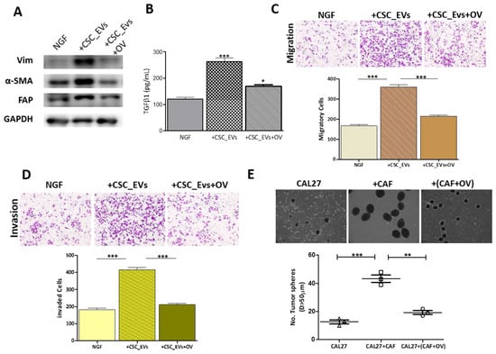 Furthermore, we examined the ability of OV to affect the TME. Our results showed that compared to the untreated control, 4 µM OV downregulated the protein expressions of the CAF markers vimentin, α-SMA, and fibronectin attachment protein (FAP) in treated cells (Figure 5A), thus indicating that OV-treated CSC_EVs (CSC_EVs+OV) exhibited a significantly lower ability to transform NGFs into CAFs, compared to control CSC_EVs. In addition, the amount of TGF-β1 secreted by NGF-derived CAFs was significantly suppressed by exposure to 4 µM OV (1.53-fold, p < 0.05) (Figure 5B). Furthermore, OV-treated CAFs were significantly less migratory (1.71-fold, p < 0.001) (Figure 5C) and invasive (1.95-fold, p < 0.001) (Figure 5D). More importantly, OV-treated cocultured CAL27 cells were significantly less capable of forming tumorspheres compared to their untreated counterparts (Figure 5E).