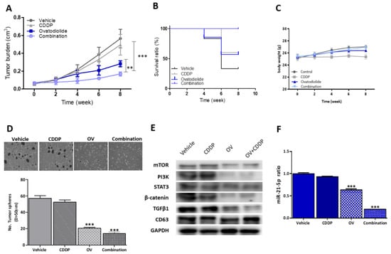 Ovatodiolide (OV) suppresses cisplatin (CDDP)-resistant CAL27 cancer stem cells (CSCs) in vivo. (A) Tumor volume versus time curve. The combination of OV+CDDP showed the most significant tumor suppressive effect followed by OV-only treatment, while groups treated with CDDP-only or the vehicle showed the largest tumor volumes. (B) Kaplan-Meier survival curve. Mice that received the combined OV+CDDP regimen showed the highest survival ratio followed by the OV-only group, while CDDP-only and vehicle mice showed the lowest survival ratios. (C) The body weight over time curve shows that all mice exhibited a steady increase in body weight over time, except for a slight decrease in mice which received the CDDP regimen. This suggests no apparent systemic toxicity of OV treatment. (D) Comparative tumor sphere-forming assay. Tumor samples collected from all experimental groups showed that OV+CDDP samples were the least capable of generating tumor spheres followed by the OV-only regimen, while the CDDP and vehicle groups were indifferent. (E) Western blots of extracellular vesicles (EVs) collected from all experimental groups. EVs from OV+CDDP and OV-only regimens showed a markedly lower level of mammalian target of rapamycin (mTOR), phosphatidylinositol-3 kinase (PI3K), and β-catenin compared to those from the vehicle and CDDP-only groups. Cluster of differentiation 63 (CD63) was used as a marker of EVs and a loading control. (F) The qPCR analysis showed the lowest level of miR-21-5p in EVs collected from the combined OV+CDDP regimen followed by OV-only, while there was no significant difference between the vehicle and CDDP-only groups. ** p < 0.01; *** p < 0.001.