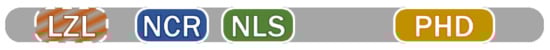 Figure 1. Linear representation of ING proteins sequence. The LZL motif (orange striped) that allows the interaction with other proteins is present on ING2, ING3, ING4 and ING5 but not ING1. The NCR domain (blue), specific to the ING family, is shared between all the INGs. The NLS domain (green) is responsible for the nuclear localization of the protein and the PHD motif (yellow) for the binding to methylated histones.