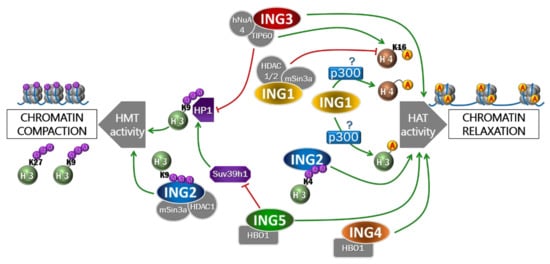 73. Nourani, A.; Doyon, Y.; Utley, R.T.; Allard, S.; Lane, W.S.; Cote, J. Role of an ING1 Growth Regulator in Transcriptional Activation and Targeted Histone Acetylation by the NuA4 Complex. Mol. Cell. Biol. 2001, 21, 7629–7640. [Google Scholar] [CrossRef] [PubMed]
