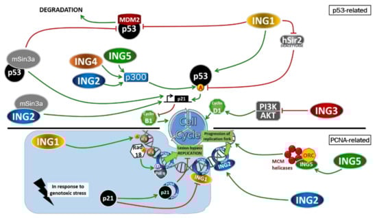 Cell cycle regulation and DNA replication are well-controlled processes that prevent genomic instability. During its replication, the cell harbors various control checkpoints that are gates to prevent improper DNA synthesis or rearrangement that could lead to mutations. Uncontrolled cell proliferation is defined as a hallmark of cancer and may be the consequence of impaired checkpoints due to unbridled replication factors [46]. Several ING proteins have been described as participating in cell cycle regulation, notably through their interaction with p53, a guardian of the genome, one of the most described regulatory proteins.