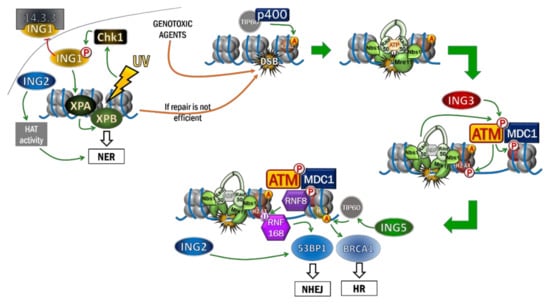 Later, it was reported that ING2 was involved in UV-induced DNA repair in the same way as ING1b [101]. Indeed, even if ING2 is not recruited to the sites of lesions after UV irradiation of melanoma cells, it enhances the repair of UV-damaged DNA in a p53-dependent manner. ING2 has been reported to induce histone H4 hyperacetylation in response to UV exposure [101]. This ING2-dependent HAT activity leads to the relaxation of chromatin and the recruitment of XPA to the sites of UV lesions to ensure NER [101] (Figure 2; Figure 4). As described by Adamson and colleagues, the role of ING1b in the DDR is focused primarily on the NERs in response to UV damage, while ING2 and ING3 would be more involved in the DSB repair [102].