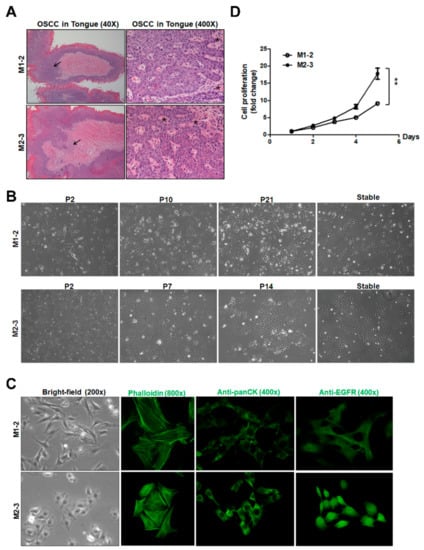 Establishment of two mouse oral squamous cell carcinoma (OSCC) cell lines from carcinogen-induced tongue tumors. (A) Histological examination of the carcinogen-induced tongue tumors at 40× (left panel) and 400× (right panel) magnifications. Black arrows indicate the tumor parts. Asterisks (*) indicate the representative keratinization and keratin-pearl formation. (B) Cell morphology of M1-2 and M2-3 cells at different passages at 100× magnification. (C) Representative images of cells at 200× magnification (left panel). Phalloidin (middle left panel), Pan-CK (middle right panel) and epidermal growth factor receptor (EGFR) staining (right panel) in M1-2 and M2-3 cells at 400× or 800× magnification. (D) A representative cell growth curve obtained by MTS assay in M1-2 and M2-3 cells. The results were expressed as the fold change to the results at day 1. Error bars represent SE; ** p < 0.01.