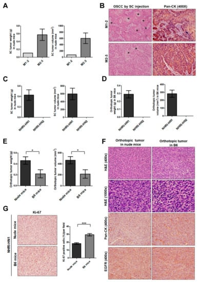 Tumor growth of M1-2 and M2-3 cells in nude mice and B6 mice. (A) Quantification of tumor weights (left panel) and volumes (right panel) in nude mice subcutaneously injected with 106 M1-2 (n = 3) or M2-3 cells (n = 3) and sacrificed at 98 days post-inoculation. (B) Histological examination of the subcutaneous xenografts in nude mice with H&E staining (left panel) and IHC with anti-pan CK (right panel) at 400× magnification. Asterisks (*) indicate representative keratinization and keratin-pearl formation. (C) Quantification of tumor weights (left panel) and volumes (right panel) in nude mice subcutaneously injected with 106 NHRI-HN1 (n = 4) or NHRI-HN2 cells (n = 4) and sacrificed at 42 days post-inoculation. (D) Measurement of the tumor weights (left panel) and volumes (right panel) in B6 mice orthotopically injected with 5 × 105 NHRI-HN1 (n = 20 in total for four independent experiments) or NHRI-HN2 cells (n = 3) and sacrificed at 36–40 days post-inoculation. (E) Quantification of tumor weights volumes in nude mice and B6 mice orthotopically injected with 5 × 105 NHRI-HN1 cells (n = 7 in total for two independent experiments) and sacrificed at 40 or 32 days post-inoculation. (F) Histological examination of NHRI-HN1 tumors in nude mice and B6 mice with H&E staining (upper panels) at 400× and 1000× magnifications and IHC with anti-pan CK (middle panel) and EGFR (lower panel) at 400× magnification. (G) Representative Ki-67-labeled NHRI-HN1 tumors are shown in the left panel. The percentage of positive Ki-67 signals was determined in NHRI-HN1-generated tumors in nude mice and B6 mice. Error bars represent SE. * p < 0.05; *** p < 0.001.