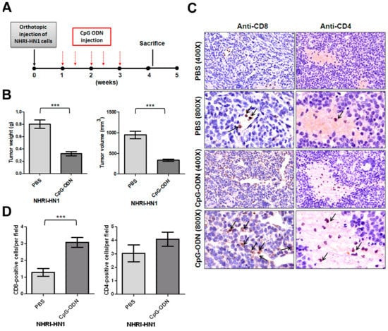 We performed peritumoral injection of an oligonucleotide containing immunostimulatory CpG motifs (CpG-ODN). CpG-ODN signals through toll-like receptor 9 to stimulate both innate and adaptive immune responses to eliminate tumor cells to understand whether host immune response affects NHRI-HN1 cell-derived orthotopic tumor development []. The weight and volume of orthotopic tumors in mice receiving CpG-ODN injection were markedly reduced as compared to those injected with phosphate buffered saline (PBS) following the scheme that is shown in Figure 3A (n = 6, p < 0.001; Figure 3B and Figure S3F). Histological examination of tumors that were treated with CpG-ODN revealed a significant increase in the number of tumor-infiltrating CD8+ T cells (Figure 3C,D). No substantial difference in the numbers of infiltrating CD4+ cells was found between CpG-ODN-treated and control tumors (Figure 3C,D). These results suggest that the NHRI-HN1 cell-generated syngeneic model is suitable for investigating the effectiveness of immunotherapy for head and neck cancers.