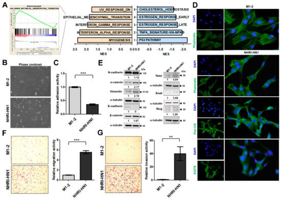 NHRI-HN1 cells demonstrated an up-regulation of interferon signaling and EMT pathway components, and down-regulation of lipid metabolism when compared to nontumorigenic cells, similar to the tumorigenesis of human OSCC (Figure 4A and Figure S4C). Yang et al. reported that primary OSCC expressing a hallmark EMT signature, low E-Cadherin, and high Vimentin has a significant increase in the satellite’s average distance when compared to those without an EMT signature [], indicating that NHRI-HN1 cells with a strong EMT signature might have greater potential to drive cancer progression. EMT has long been recognized as a major player in cancer progression and metastasis, and its characteristic protein expression has been well-investigated in oral tumorigenesis []. We demonstrated that aggressive NHRI-HN1 cells showed EMT characteristics to confirm the up-regulation of the EMT signature (Figure 4D–G).
