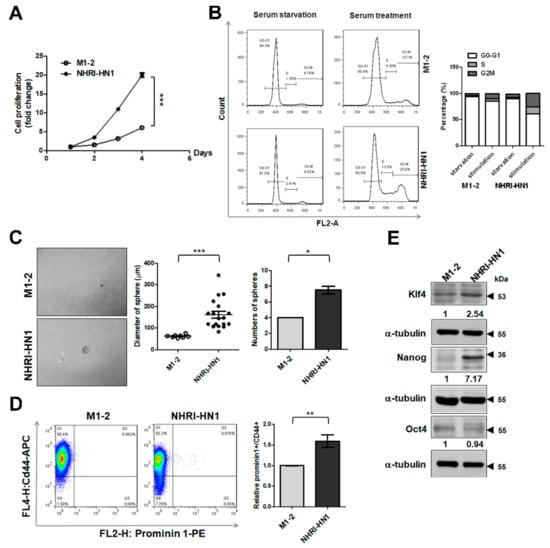 NHRI-HN1 cells have a higher growth rate than M1-2 cells (Figure 5A). Consistently higher percentages of NHRI-HN1 cells in G2/M phase of the cell cycle were detected 24 h after serum stimulation (Figure 5B). The sphere formation assay showed that NHRI-HN1 cells formed spheroids more efficiently (greater size and number of spheres) than M1-2 cells (Figure 5C). Prominin-1 (CD133) and CD44 are stemness-related markers found in a variety of human tumors, including oral cancer, and the expression of these markers has been associated with the survival and prognosis of OSCC patients [,,]. Fluorescence-activated cell sorter (FACS) analysis using anti-Prominin-1 and anti-CD44 showed that 0.075% of Prominin-1+/CD44+ cells were detected in NHRI-HN1 cells, whereas only 0.062% of double-positive cells were observed in the M1-2 cells (Figure 5D). We also analyzed the expression of stemness-related transcription factors, such as Klf4, Nanog, and Oct4 [], and found an elevated expression of Klf4 and Nanog in NHRI-HN1 cells as compared to M1-2 cells (Figure 5E).