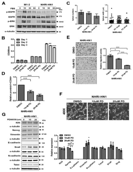 Additionally, the basal level of ERK phosphorylation was higher in NHRI-HN1 cells than in M1-2 cells under serum starvation (Figure 6A), which indicated constitutively active ERK in NHRI-HN1 cells. ERK activation was also demonstrated in some human OSCC cells, including OC3, OEC-M1, TW2.6, and SAS, as compared to dysplastic oral keratinocytes (DOKs) (Figure S6A). The mitogen-activated protein kinase (MAPK) kinase inhibitor PD98059 suppressed ERK phosphorylation in NHRI-HN1 cells (Figure S5C) and it had slight inhibitory effects on cell growth of NHRI-HN1 cells on day 3 (Figure 6B), while PD98059 treatment inhibited the number of NHRI-HN1 cell spheres (Figure 6C). The relative amounts of Prominin-1+/CD44+ cells were significantly suppressed in PD98059-treated NHRI-HN1 cells (Figure 6D), and the migration activity of NHRI-HN1 cells was markedly diminished by PD98059 treatment in a dose-dependent manner (Figure 6E). However, PD98059 treatment did not lead to changes in the shape of NHRI-HN1 cells when compared to untreated controls (Figure 6F). Immunoblot analysis showed decreased Nanog expression in PD98059-treated NHRI-HN1 cells as compared to the untreated cells, but no differences in the expression of the other stemness- and EMT-related proteins assessed (Figure 6G). The blocking ERK activation in human SAS and OEC-M1 cells did not affect cell growth (Figure S6B), but it did suppress sphere formation (Figure S6C) and cell motility (Figure S6D). Our data indicate that ERK activation is required for enhanced cancer stemness and the migration of NHRI-HN1 and human OSCC cells.