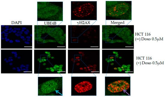 UBE4B ligase coordinates DNA double-strand break repair and apoptosis induction in Caenorhabditis elegans [39]. UBE4B forms focal accumulations after DSB’s induction upon Ionizing Radiation (IR) which is independent of its ligase activity. Thus, UBE4B seems to play a key role as part of a bona fide cellular network which facilitates the communication between DNA repair and apoptotic response [39]. Notably, unpublished data from our team showed the nuclear presence of UBE4B foci also in HCT116 (human colorectal carcinoma cell line) and co-localization with DSBs following Doxorubicin administration (Figure 1).