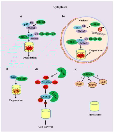 In summary, p53 turnover is regulated by both MDM2 and UBE4B in a cancer cell. Mono-ubiquitination of p53 on single or multiple sites is usually followed by a poly-ubiquitination of these sites through UBE4B. The elongated ubiquitin chain renders the modified p53 molecule recognizable by the proteasome. This process reduces the protein expression levels and transcriptional activity of p53 in the cytoplasm and in the nucleus, respectively (Figure 2a,b). Based on the proposed model of oncogene-induced cancer development [74], p53 is a key effector of the DDR and therefore UBE4B can be considered as an oncogene due to the down-regulation of p53. Moreover, some reports indicate the contribution of UBE4B towards cancer cell survival upon DNA damage induced by factors such as chemical agents or IR. This is also linked with the well-studied interaction between UBE4B and p53 family members [9,57,65]. A recent study not only supports this notion but also focuses on the role of mir-1301 as a novel negative regulator of UBE4B. Actually, this micro-RNA potentially halts cancer cell migration and metastasis via stabilization of p53 [75]. Despite the growing amount of evidence which implicate UBE4B in cancer development, the precise regulation of UBE4B over p53 and how this could drive cancer progression requires further investigation. Moreover, according to recent findings, UBE4B interacts physically with p73a isoform in various cancer cell lines, hindering the tumor-suppressor activity of p73a by promoting its proteasomal degradation (Figure 2c). This potential tumorigenic role of UBE4B has been confirmed in head, neck and lung cancer cell lines. In addition, it seems that UBE4B weakens ubiquitination of ΔΝp63a (Figure 2d). On the other hand, a potential interaction of UBE4B with other p53 family members such as p73β, ΔΝp73 and p63β isoforms has not yet been confirmed and whether these isoforms are indeed influenced by this ligase remains to be elucidated (Figure 2e).