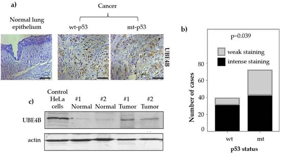 UBE4B has been found either overexpressed or suppressed in diverse types of human cancer [10,38,46,56,81,82]. It is noteworthy that a 500-kb genetic locus in the small arm of chromosome 1 is frequently mutated in neuroblastoma (NBL) cases [10,81]. Deletion of this region within 1p36.2-3 has been linked with the inactivation of tumor suppressors including the UBE4B ligase [10,81]. Moreover, a variety of single nucleotide polymorphisms (SNPs) have been described within the coding region of the UBE4B gene, but they do not seem to affect NBL development [10,81]. Among them, only the c.1439 + 1G > C SNP was found to affect a splice donor site mutation of exon 9 and was associated with a poor outcome of stage 3 patients [10,81]. Three potential regions within 1p36.1-3 susceptible to deletions have been linked with Oral Squamous Cell Carcinoma progression [82]. On the other hand, brain tumors such as medulloblastoma and ependymoma exhibit elevated protein levels of UBE4B which are often attributed to increased levels of mRNA, whereas sometimes augmentation of mRNA levels is related to gene amplification [46]. Interestingly, the observed loss of p53 function in brain tumors could be due to the negative regulation from UBE4B, leading p53 to an MDM2-mediated degradation through the proteasome [46]. UBE4B protein has also been reported to be overexpressed in breast cancer tissues, while both protein and mRNA levels are increased in hepatocellular carcinomas [38,56]. Preliminary unpublished data from our group also clearly indicate increased levels of this ligase in Non-Small Cell Lung Cancer (NSCLC) tissues compared to their normal counterparts (Figure 3a,c). This difference in expression is observed regardless of the genetic status of p53 (either wild type or mutated) (Figure 3a). However, UBE4B seems to be expressed at higher levels in a wt-p53 environment in contrast to cases with mutant p53 (Figure 3a,b). Upon monitoring of UBE4B expression in colon cancerous tissues, we found the same expression pattern detected in lung cancer, which is the upregulation of UBE4B ligase in malignant areas relative to the normal ones.