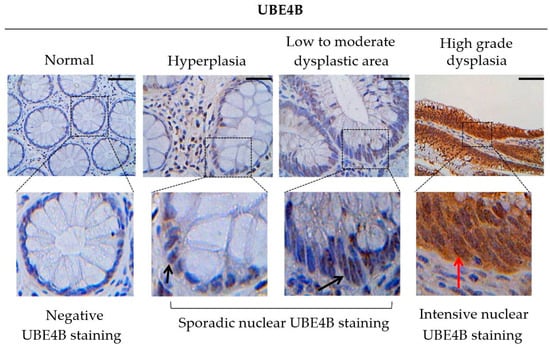 Comparison of UBE4B in colon pre-cancerous lesions in relation to normal areas. In hyperplasia and low to moderate dysplasia, UBE4B seems to be overexpressed sporadically in some nuclei of tubular glands of Lieberkühn (black arrows). In high grade dysplasia, the intensity of staining is higher (red arrow). Scale bar: 50 μm.