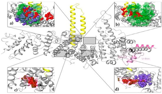 A three-dimensional structural homology model of human UBE4B, derived from comparative modelling with Ufd2p. The protein is shown in a “ribbon” representation, with a U-box domain colored pink. Important residues, found to be involved with Cdc48 binding [85,86], are depicted in a “ball and stick” representation, colored black. Selected a-helixes are colored yellow for viewing reference. Druggability analysis (likelihood of ligands binds tightly) [79,80,81] results are also illustrated in (a–d): Sitemap as small red spheres, fpocket as large blue spheres and CavityPlus as green surfaces. Only high-ranked cavities with particularly promising druggabilities were collected and compared from each program. All three algorithms converged with respect to the protein cavity shown in (a), whereas two out of the three suggested a promising druggability of cavities shown in (b,d). The highest druggability score (SiteScore: 1.293; D-score: 1.368; threshold for druggable sites: > 0.80) with Sitemap was observed for cavity shown in (c), which is adjacent to C757 residue.