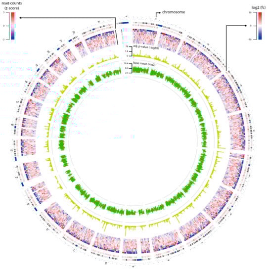 Overview of RNA sequencing data. The circus plot shows statistics of the genes (n = 16,672) that were selected for differential gene expression analysis. The plot contains four circles: Layer 1 is log2fold-change of the genes; Layer 2 is read counts of the genes that were transformed to z-score; Layer 3 is adjusted p-value of the genes that were transformed by–log10; and Layer 4 is the base mean of the genes that were transformed by log2.