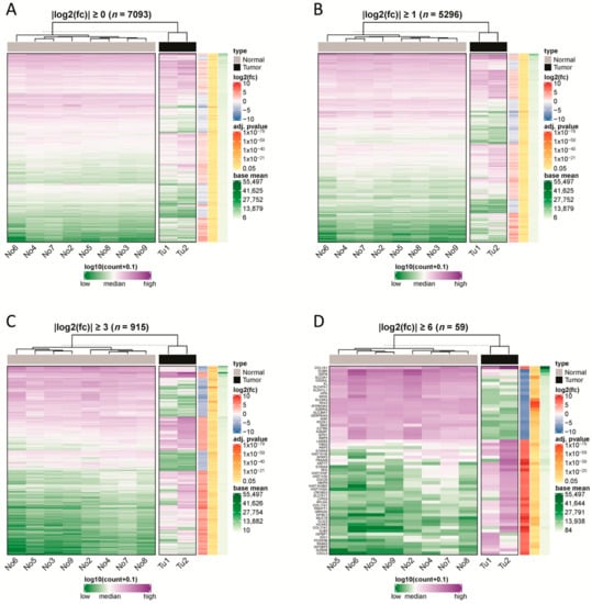 Hierarchical clustering of samples using differentially expressed protein-coding genes. We used different-fold changes as a threshold to filter significantly differentially expressed protein-coding genes (adjusted p-value ≤ 0.05). Read counts of the genes were used to cluster normal and tumor samples based on their Euclidian distance. In addition, we annotated the selected genes with their log2fold-change, adjusted p-value and base mean of their read counts. The thresholds used were (A) |log2fold-change| ≥0, (B) |log2fold-change| ≥1, (C) |log2fold-change| ≥3, and (D) |log2fold change| ≥6.