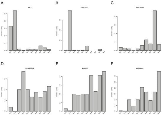 The mRNA transcripts were detected using TaqMan gene expression assays (Thermo Fisher Scientific) according to the manufacturer’s protocol. Briefly, 1 µg of RNA was reverse transcribed using the Maxima cDNA synthesis kit (Thermo Fisher Scientific). The reactions were carried out using the StepOne Plus Real-Time PCR System (Thermo Fisher Scientific) in triplicate in a final volume of 10 µL with cDNA equivalent to 25 ng RNA, using TaqMan gene expression assays (SLC7A11, Hs00921938_m1; HIST1H3B, Hs00605810_s1; HK2, Hs00606086_m1; PPARGC1A, Hs00173304_m1; ALDH6A1, Hs00194421_m1; MARC2, Hs01550747_m1; SLC47A1, Hs00217320_m1) and PCR reagents according to the manufacturer’s instructions. No template controls were included in the reaction plates. Thermal cycling conditions were 95 °C for 20 s, followed by 40 cycles of 95 °C for 1 s and 60 °C for 20 s. GAPDH (Hs99999905_m1, Thermo Fisher Scientific) served as the endogenous reference. Relative mRNA expression levels were calculated according to the ∆∆Ct method [].