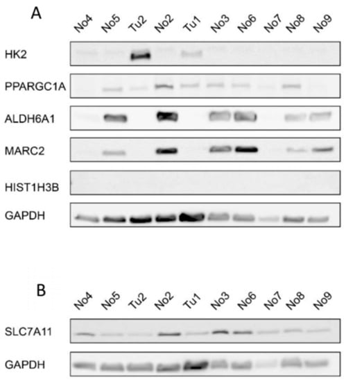 Protein expression of selected genes with deregulated expression in CDCs. (A) Western blot for HK2, PPARGC1A, ALDH6A1, MARC2, and HIST1H3B with GAPDH as the reference protein and (B) for SLC7A11 with GAPDH as the reference protein. Tu-tumor tissue sample; No-normal tissue sample.