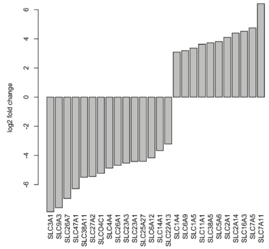 As previously described, many SLC genes in CDC are dysregulated in comparison to normal tissue samples [,]. Therefore, we decided to investigate the expression of SLC genes in more detail. After applying a |log2fold change| ≥3 cutoff, a total of 15 SLC genes (SLC3A1, SLC4A4, SLC6A12, SLC9A3, SLC14A1, SLC22A13, SLC23A1, SLC23A3, SLC25A27, SLC26A1, SLC26A7, SLC27A2, SLC38A11, SLC47A1, and SLCO4C1) were found to be significantly downregulated, and 11 SLC genes (SLC1A4, SLC1A5, SLC2A1, SLC2A14, SLC5A6, SLC6A9, SLC7A5, SLC7A11, SLC11A1, SLC16A3, and SLC38A5) were significantly upregulated in CDC samples compared to normal samples (Figure 5). With even more stringent criteria of a |log2fold change| ≥6, four SLC genes (SLC3A1, SLC9A3, SLC26A7, and SLC47A1) were still significantly downregulated.