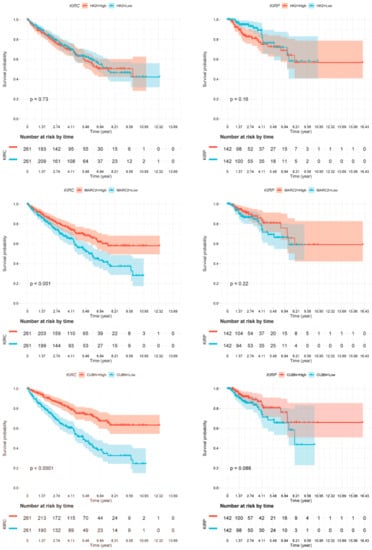 Several of the genes identified by our approach were confirmed to be of prognostic relevance in the ccRCC patient cohort (KIRC). Low MARC2 gene expression was significantly associated with poor overall survival (p = 0.001). Moreover, low expression of CUBN (p < 0.0001) and SLC47A1 (p < 0.0001) and high expression of the gene KRT17 (p = 0.0032) were significantly associated with poor overall survival (Figure 6). However, none of the genes analyzed were associated with overall survival in the pRCC (KIRP) patient cohort.