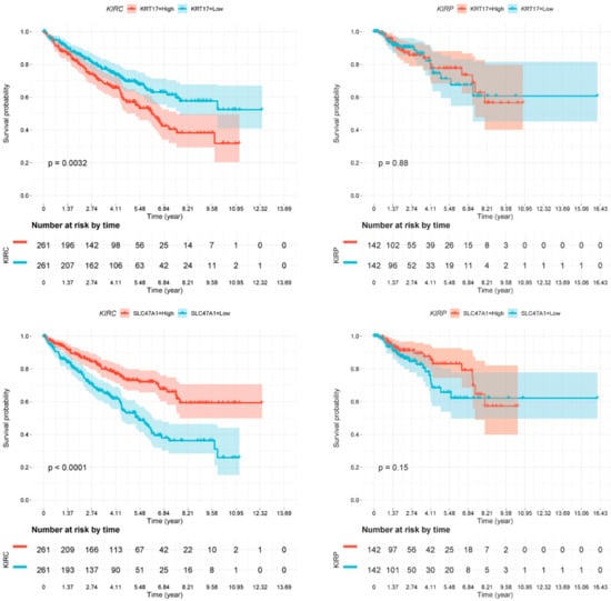 We extracted RNA sequencing data from 522 clear cell renal cell carcinoma (KIRC) patients and 284 papillary cell renal cell carcinoma (KIPR) patients from the TCGA database []. Patients were divided into two groups (high or low) based on their expression levels of the genes of interest (i.e., HK2, MARC2, CUBN, KRT17, SLC47A1). Patients at the top 50% expression level of a gene were assigned to the high group, and the other patients were assigned to the low group. Patient survival times were calculated as the number of days from initial pathological diagnosis to death, or the number of days from initial pathological diagnosis to the last time the patient was known to be alive. These times were used to generate the Kaplan-Meier survival plots using RTCGA (https://rtcga.github.io/RTCGA).