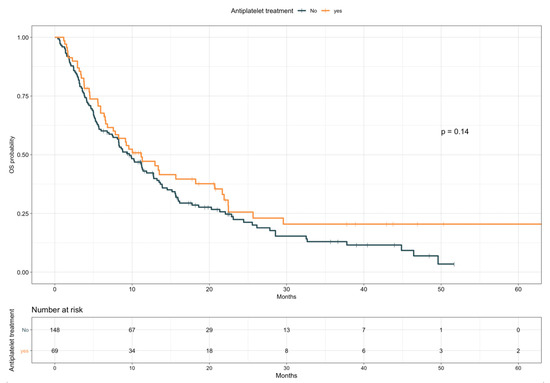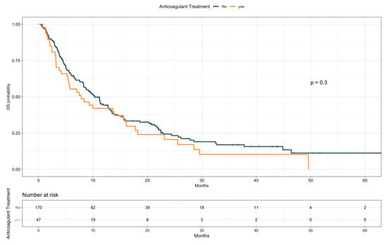 The impact of TE events and anticoagulant and antiplatelet treatments on patients’ OS was first assessed by univariate analysis (Table 5). Given the preliminary associations with a better objective response rate, disease control rate, and treatment duration, the effect of TE diagnosis on OS was first explored as a time independent variable. Patients experiencing TE events showed longer OS compared with those who did not (median, 15.9 vs. 8.8 months, HR 0.59; 95% CI, 0.37–0.93; p = 0.02; see Figure S5). However, with TE events defined as a time varying covariate, we observed an increased risk of death following a diagnosis of TE, with an overall univariable HR of 1.70 (95% CI, 1.06–2.72; p = 0.029). No significant impact on OS was detected for anticoagulant treatment (median, 7.8 vs. 10.3 months, HR 1.21; 95% CI, 0.84–1.73; p = 0.31; Figure 2), considered either prophylactic or therapeutic, nor for antiplatelet therapy, despite an observed favorable trend (median, 11.2 vs. 9.6 months, HR 0.78; 95% CI 0.55–1.09; p = 0.14; Figure 3). A multivariate model including other covariates statistically associated with OS (i.e., ECOG PS, PD-L1 status, line of treatment, and LIPI) was performed. Since NLR and PLR positively correlated with each other (Pearson coefficient correlation = 0.68; p < 0.001) and NLR was included in the LIPI, PLR was excluded from the multivariate analysis. In this model, TE events kept an independent negative prognostic value in terms of OS (HR 2.93; 95% CI 1.59–5.42; p = 0.0006; Table 6).