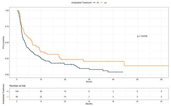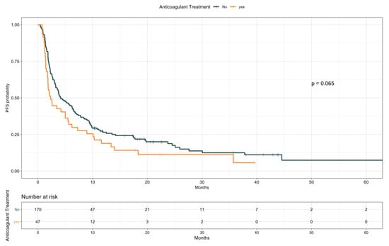 When looking at PFS (Table 7), antiplatelet drugs users were characterized by a longer PFS compared to nonusers (median, 6.4 vs. 3.4 months, HR 0.67; 95% CI 0.48–0.92; p = 0.015; Figure 4). Notably, a comparable difference was observed when restricting the analysis only to patients taking ASA (median, 6.5 vs. 3.4 months, HR 0.67; 95% CI 0.48–0.94; p = 0.021; Figure S6). Conversely, baseline anticoagulants use resulted in a trend for worse PFS (median, 2.3 vs. 4.2 months, HR 1.38; 95% CI 0.98–1.96; p = 0.065; Figure 5). Patients receiving anticoagulant treatment had significantly worse baseline ECOG PS (see Table S3), which could explain the lower PFS experienced upon ICIs. In the multivariate model including other covariates statistically associated with PFS (i.e., ECOG PS, PD-L1 status, presence of liver metastases, line of treatment, and LIPI), antiplatelet and anticoagulant treatments did not confirm an effect on patients PFS (HR 0.96; 95% CI, 0.59–1.57; p = 0.88, and HR 1.38; 95% CI, 0.82–2.32; p = 0.22, respectively; Table 8).