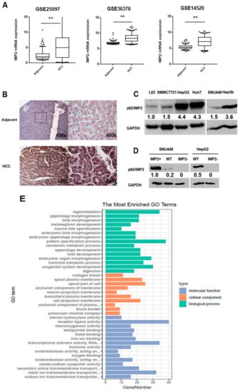 p62/IMP2 is overexpressed in HCC tissues and cell lines. (A) mRNA expression of p62/IMP2 in tumor tissues and their controls in datasets GSE 25097, GSE 36376, and GSE 14520, respectively. * p < 0.05, ** p < 0.01 (B) Immunohistochemical staining of p62 in liver cancer tissue and adjacent normal tissue slides. Weak stain pattern of p62 in representative adjacent normal tissue, and positive stain pattern of p62 in representative liver cancer tissue (×100 and ×400 magnification). (C) p62/IMP2 protein expression tested by western blotting analysis for the human fetal cell line L02 and five liver cancer cell lines. (D) p62/IMP2 overexpression (IMP2+) and knockout (IMP2-) in liver cancer cell lines were verified by western blotting analysis. (E) Gene ontology analysis was performed between the p62/IMP2 high expression group and low expression group in dataset GSE 14520.