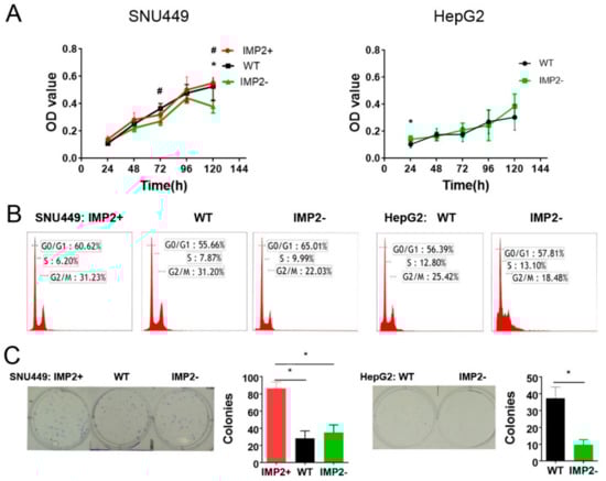 P62/IMP2 does not significantly promote cell proliferation but reduces cell population dependence and enhances the ability to form colonies (A) Growth curve of the cell proliferation assay in SNU449 and HepG2 cells. SNU449 IMP2+ vs. SNU449 IMP2−: # p < 0.05; SNU449 (WT) vs. SNU449(IMP−): * p < 0.05 (two-way ANOVA, n = 3). HepG2 (WT) vs. HepG2 (IMP−): * p < 0.05 (multiple t-test, n = 3). (B) Cell cycle of p62/IMP2 variants tested by flow cytometry. (C) Plate clonogenic assay p62/IMP2 variants from two liver cancer cell lines. High expression of p62/IMP2 could promote colony formation ability in liver cancer cells. * p < 0.05 (one-way ANOVA, n = 3).