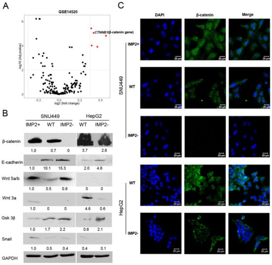 Activated Wnt/β-catenin signaling was observed in p62/IMP2 overexpression cells. (A) DEGs analysis with a metastasis-related gene list. The –log10 (adj. p value) and LogFC (log 2 conversion of the fold change) between the p62/IMP2 high expression group and p62/IMP2 low expression group was shown in a scatter diagram. (B) Western blotting analysis of Wnt/β-catenin signaling and EMT-related proteins. (C) Immunofluorescence staining of β-catenin in SNU449 and HepG2 cells. A clear nuclear expression pattern of β-catenin was shown when p62/IMP2 was expressed highly. Cell nucleuses were stained with DAPI (blue).