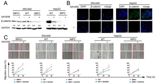 Inhibition of Wnt/β-catenin signaling can reduce migration ability in liver cancer cell lines. Liver cancer cells were cultured with 10 μM Wnt/β-catenin signaling XAV939 for 24 h before harvest. (A,B) Western blotting analysis and immunofluorescence showed β-catenin expression was significantly inhibited by 10 μM XAV939. (C) XAV939 repressed migration ability in p62/IMP2 overexpression and wild-type liver cancer cells. In contrast, XAV 939 did not show inhibition of migration ability in IMP2 knockout cells. A wound scratch image was taken every 24 h, the wound healing area was quantified and each point (48 h per time in the HepG2 line). * p < 0.05 (two-way ANOVA, n = 3).