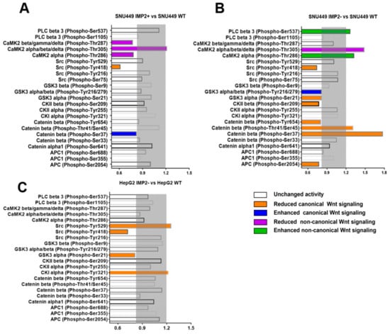 Overexpression of p62/IMP2 influenced phosphorylation in the Wnt signaling cascade in liver cancer cells. The change of the phosphorylation rate (phosphorylated protein/phosphorylated protein) between each transfected variant and their corresponding wild-type variants was tested by a phosphoproteome array, which screened the total cell lysates from each variant. The gray area was defined as the “no change area” (≥83%/≤120%). The induction/reduction of phosphorylation sites is shown with color when their bar is out of the gray area boundaries. (A) Fold change of indicated phosphoproteins between SNU449 IMP2+ and SNU449 WT cells. (B) Fold change of indicated phosphoproteins between SNU449 IMP2− and SNU449 WT cells. (C) Fold change of indicated phosphoproteins between HepG2 IMP2− and HepG2 WT cells.