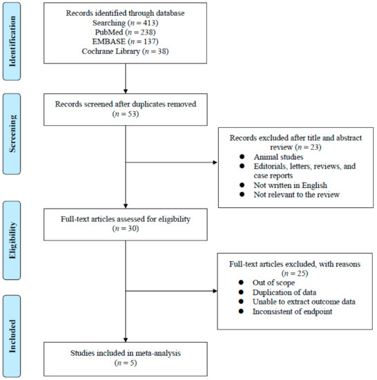 The results for the PRISMA flow diagram are presented in Figure 1. The initial database search found 413 studies (137 in Embase, 238 in PubMed, and 38 in the Cochrane library). Among them, 53 studies remained after duplicates were removed. After reviewing the titles and abstracts, 23 articles were excluded. Subsequently, analysis of the full-text articles was performed based on pre-established inclusion criteria. Finally, five studies with a total of 553 patients were included. Information on the included studies is presented in Table 1. All five studies were retrospective case–control studies [16,17,18,19,20]. Three were conducted in Japan [17,18,20], one in the United States [19], and one in Japan and the United States [16]. Patients enrolled in the Maughan et al. study were also participants in the Terada et al. study [16,19]. All trials enrolled patients diagnosed with CRPC who had undergone ARAT treatment according to either ABI–ENZA or ENZA–ABI. In addition, the studies of Maughan et al. and Mori et al. included both chemo-naïve and post-chemotherapy CRPC patients [17,19]. The other studies were performed only in chemo-naïve CRPC patients [16,18,20].