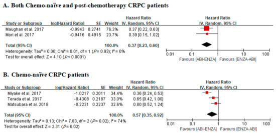 Forest plots for progression-free survival in studies including both chemo-naïve and post-chemotherapy castration-resistant prostate cancer (CRPC) patients (A) and chemo-naïve CRPC patients only (B).