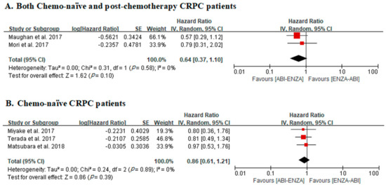 In two studies that included both chemo-naïve and post-chemotherapy CRPC patients, there was no significant difference in OS between ABI–ENZA and ENZA–ABI groups (adjusted HR, 0.64; 95% CIs, 0.37–1.10; p = 0.10). No heterogeneity was identified across studies (Cochran Q statistic, p = 0.58; I2 statistic, 0%) (Figure 3a).