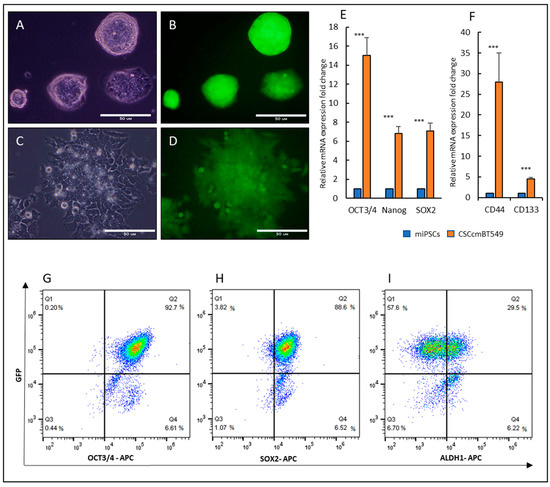 Morphology and Expression of GFP, stemness and cancer stem cell markers in CSCcmBT549 cells when compared with those in mouse induced pluripotent stem cells (miPSCs). (A,B) Representative images of miPSCs colony morphplogy using the bright field and fluorescence showing the expression of GFP in culture media with LIF. Scale bars represent 50 μm. (C,D) Representative images of CSCcmBT549 cells using bright field and fluorescence showing the expression of GFP in the cells after selection by puromycin. Scale bars represent 50 μm. (E,F) Gene expression levels of stem cell markers, OCT3/4, Nanog and Sox2 (E) and cancer stem cell markers, CD133 and CD44 (F) evaluated by RT-qPCR. The gene expression levels normalized by GAPDH expression were compared between CSCcmBT549 cells and miPSCs. (G–I) Flow cytometry analysis for stemness markers, (G) OCT3/4 and GFP, (H) SOX2 and GFP, (I) ALDH1 and GFP. GFP level is in parallel with Nanog expression *** p < 0.001.