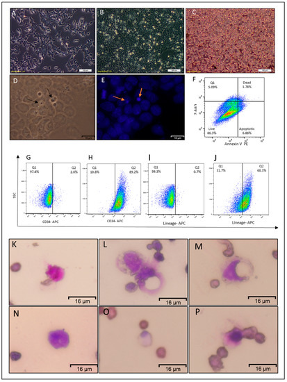 Characterization of the non-adherent round cells. (A) Representative image of CSCcmBT549 after 24 h of seeding. (B) Representative images of CSCcmBT549 cells after 72 h of seeding, showing round non-adherent cells on the top of the monolayer of adherent cells. (C) Floating non-adherent cells collected from the culture of CSCcmBT549 cells. Scale bars for (A,B,C) represent 100 μm. (D,E) Bright field and DAPI staining showing nuclei of round non-adherent cells (NACs) on the top of the monolayer adherent cells. Scale bars represent 16 μm. (F) Representative image of flow cytometry analysis of apoptosis assay by” Annexin V and 7-AAD kit” shows that the majority of the cells are viable while apoptotic and dead cells are less than 15%. This image is representative of at least three independent experiments. (G–J) Flow cytometry analysis for CD34 and hematopoietic lineage differentiation markers (Lineage Cell Detection Cocktail-Biotin, where (G,I) are for adherent CSCcmBT549 cells and (H,J) are for NACs. Each result is shown as a representative of at least three independent experiments. (K–P) Wright–Giemsa staining of floating cells showing different diameters and staining patterns. Scale bars represent 16 μm.