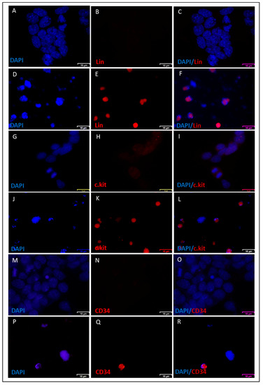 NACs smeared on slides and adherent CSCs cultured on cover slides that were coated with 0.1% gelatin were fixed while using 4% paraformaldehyde (Wako, Tokyo, Japan) for 20 min., washed two times with PBS, and then blocked using PBS containing 10% FBS at room temperature for one hour. The cells were then incubated overnight at 4 °C with primary antibodies, lineage cell detection cocktail-biotin antibody (Miltenyi Biotec, Bergisch Gladbach, Germany), anti-CD34 antibody (Santa Cruz Biotechnology, Dallas, TX, USA), and anti-CD117/c-kit (Zytomed systems, Berlin, Germany). After incubation, the cells were washed three times with PBS and then incubated with secondary antibodies, Alexa Fluor 555 labeled anti rabbit IgG goat antibody (Thermo Fisher, Waltham, MA, USA), APC labeled anti-Biotin antibody (Miltenyi Biotec, Bergisch Gladbach, Germany), and PE labeled anti-mouse IgG goat antibody (BioLegend, San Diego, CA, USA) for 1 h. Thereafter, they were washed three times with PBS and then mounted with VECTASHIELD® Antifade Mounting Medium with DAPI (Vector Laboratories, Burlingame, CA, USA). The cells were observed with the Olympus FV-1000 microscope (Olympus, Tokyo, Japan).