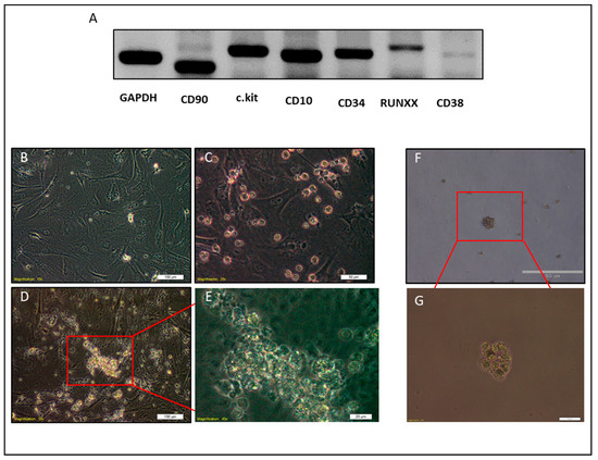 Molecular phenotyping and clonogenic test of NACs. (A) Agarose gel electrophoresis of NAC transcripts amplified by RT-PCR. (B–E) Representative images of clonogenic test on MEFs, (B) MEFs cells before seeding of NACs (C) MEFs and NACs cells on the day 1. (D,E) Representative images of the colony of NACs after one week of culture on MEFs. F, G) Clonogenic test on semisolid media (methylcellulose). Scale bars represent: (B,D) 100 μm, (C,F) 50 μm, and (E,G) 20 μm.